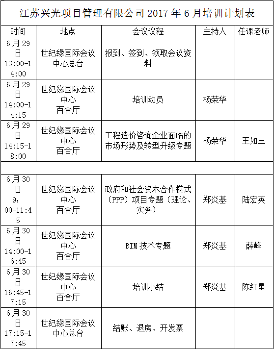 为了更好地让员工了解行业现状及人才发展方向,江苏兴光项目管理有限公司2017年度培训计划安排在6月29日(星期四)、6月30日(星期五),培训主要内容为: