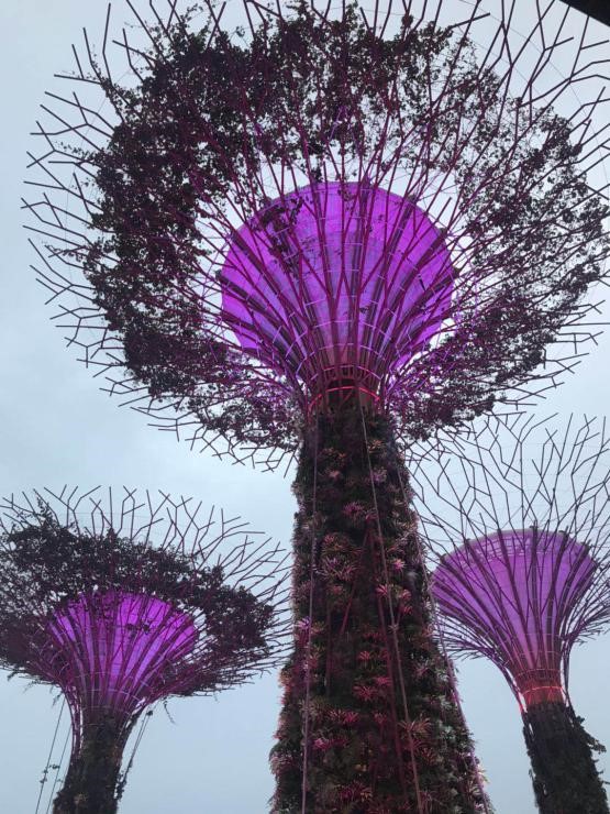 滨海湾花园是新加坡令人惊叹的“绿色新天地”。它由东花园、南花园和中花囩三部分组成。占地101公顷,这对寸土寸金的新加坡而言实属难得。整个园内囊括了约25万余株珍稀植物,上千种世界唯一的植物种类。园中最吸引人眼球的恐怕就是“花之穹顶”了,“云之森林”在“空中温室”拔节而起,直冲云霄。白天在阳光照射时美艳绝伦、赏心悦目,夜晚在灯光的映衬下,仿佛置身于童话世界,让人似梦似幻、如痴如醉。