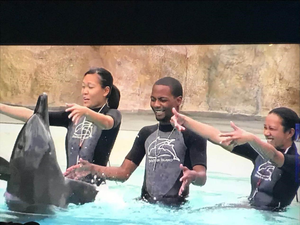 我们走进了蔚蓝的海底世界,亚洲最大的海洋生物馆。在这里有近万种鱼类和爬虫、无脊椎类动物。缓缓进入长长的隧道,透过晶莹的玻璃纤维罩,充满激情地观赏着这些海中生物。它们在湛蓝的天空中自由飞翔,在美丽的珊瑚树翠嫰的海草里翩翩起舞,五光十色,体态万千。一会儿轻盈地游动,显得特别斯文安静和几份温柔;一会儿嬉闹着前行,又显得在争先恐后中狰狞和恐怖。大家捧着手机不停地拍下这美好的瞬间,与色彩为伍,与海鱼同生。