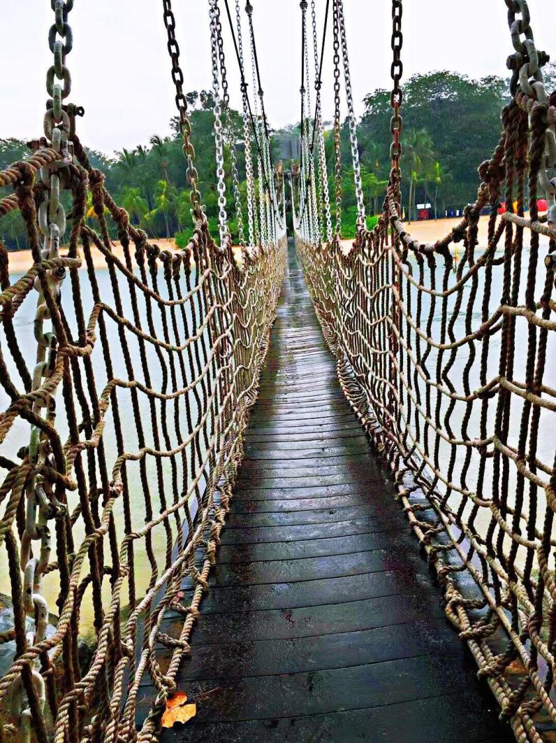 圣淘沙四面环海,拥有新加坡3个最具特色的海滩——西乐索、巴拉湾、丹戎海滩。海滩的周围,花卉争奇斗艳、椰树随风婆娑,稀稀落落的茅亭,更增添了沙滩的南洋风情。我们慕名来到了巴拉湾海滩。巴拉湾海滩最引人入胜是横跨巴拉湾海面连接一方小岛的吊桥。吊桥的另一端是亚洲大陆的最南端,亦是亚洲最接近赤道的地区。一位妈妈站在吊桥这端高高的木质阁楼上眺望着海的对岸,因为那儿有她心爱的女儿。她默默地念道着:妈妈在这头想你,女儿你在那头想妈妈吗?通过这海浪拍打的海水带去妈妈对你的问候,但愿女儿你一切顺安,也但愿我们母女俩早日相聚!