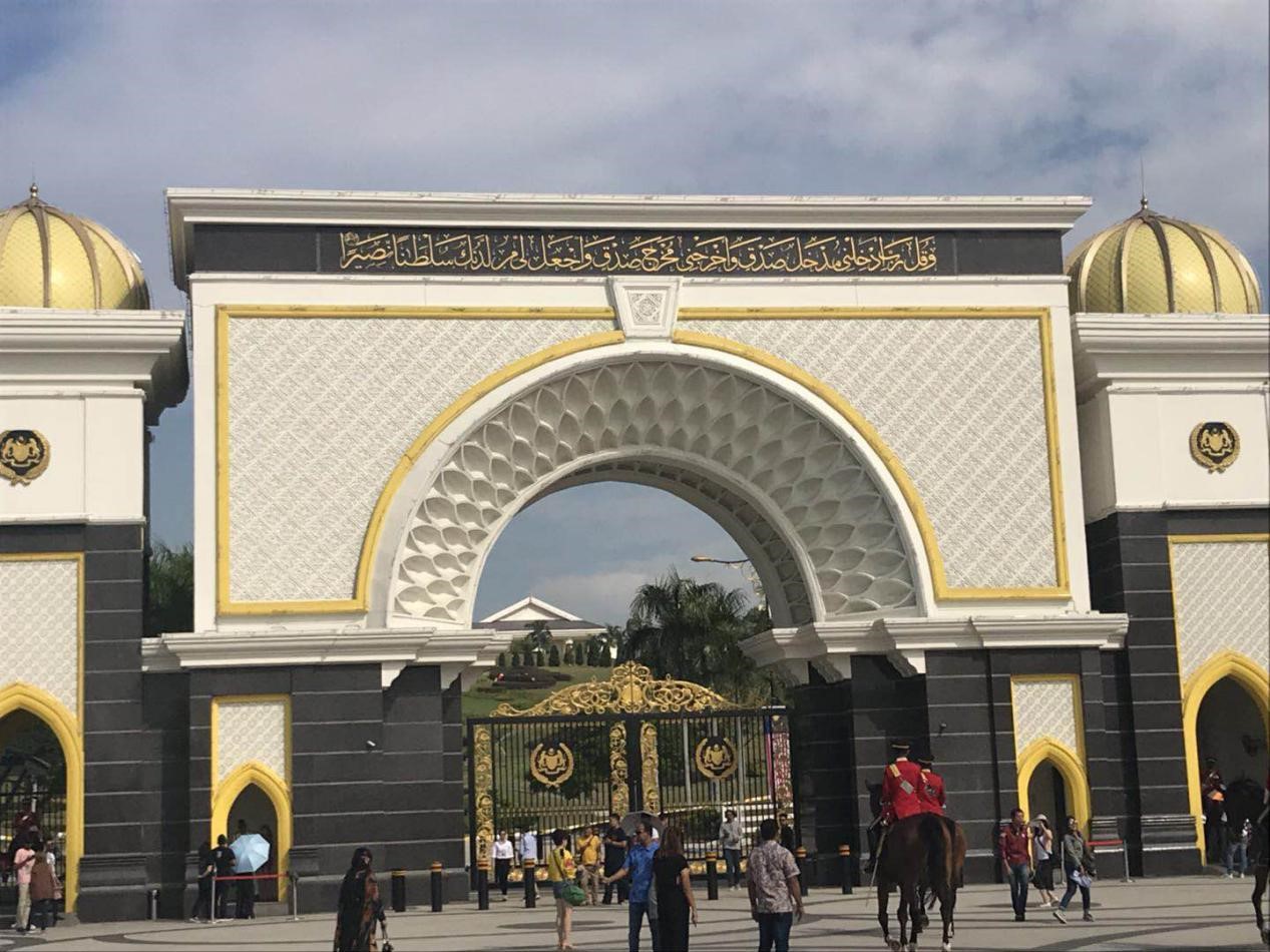 参观皇宫是我们在马来西亚的最后一站。苍翠的山丘上耸立着阿拉伯建筑风格的皇宫。宫廷旗杆上,飘扬着绘有14道红白横条,在蓝底上有14颗黄星,棒着一弯新月的国旗。14道横格代表全国13个州和1个政府;14颗金星,象征着马来西亚全国人民大团结,蓝色代表国家元首的颜色,象征着至高无上的权力。