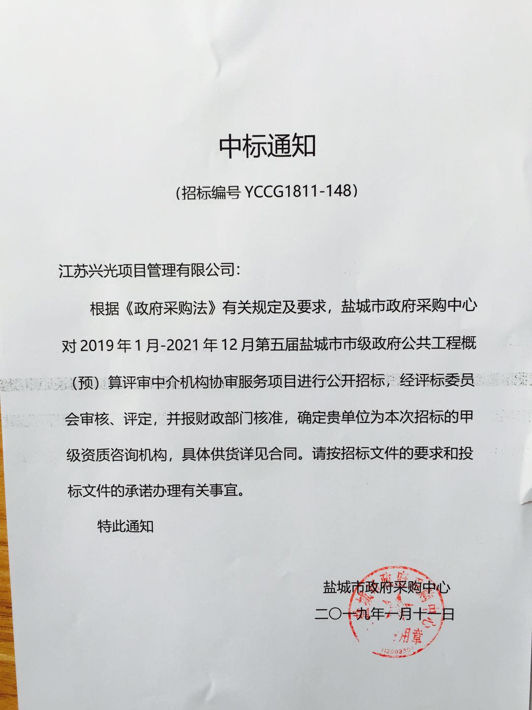 我司中标2019年1月-2021年12月第五届盐城市市级政府公共工程概(预)算评审中介机构协审服务项目。