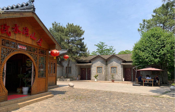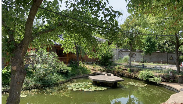 之前已经预定好了农家乐,熟悉路况的早已穿过村中的小路,到达坐落在一片葱葱郁郁山林中的浅水湾山庄。慵懒的时光在这里慢慢流淌,没有城市的喧嚣,唯有舒服的枝头蝉鸣,熟悉的鸡犬相闻。山庄颇有小桥流水般的江南古典建筑之美,首先映入眼帘的便是那与竹林相得益彰的凉亭,可以登高望远的石板台,穿过山庄的竹屋主楼,瞬间被眼前美景所吸引,想起林语堂说过,“宅中有园,园中有屋,屋中有院,院中有树,树上见天”,错落有致的木头栅栏,古朴的青砖砌成的小楼,拐角处绽放的小花,如翡翠般晶莹剔透的池塘,果真是不亦快哉。小伙伴们陆续抵达,自然而然的凑成三两桌,乡间午前的阳光已是很耀眼,大家聚在亭中,悠闲的慢城之旅在一片呼朋唤友的打牌声中开启。还有一些人错过了牌友,索性放下手中物什,或站在观景台上,眺望远方,感受着微风拂面,赞叹碧空如洗;或漫步路,寻觅风土人情,历史典故,体会着融入自然美好生活。