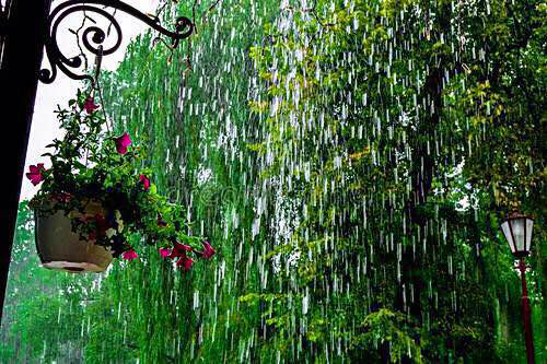 夏天的雨,不似春雨的娇羞和缠绵,但也洒下了一丝清新、一片清凉。他突然而作,又戛然而止,来也匆匆,去也匆匆,来则轰轰烈烈、气势汹汹,去则大步流星,昂首挺胸,如此潇洒快捷,如此豪迈随意,让人们享受到了夏雨之凉、夏雨之爽、夏雨之乐。当闪电和雷声同频共振,由远及近、由上至下地在云层之间滚动时,奏响了暴风雨即将来临的序曲。当雷电交加、狂风大作时,顷刻暴雨随之而来,豆大的雨点就会从天上猛砸下来。正如苏轼写过的诗一样:“黑云翻墨未座山,白雨跳珠乱入船。卷地风来突吹散,望湖楼下水如天。”很贴切地表达了变化无常的夏天气候,突出了暴雨骤至又雨过天晴的特殊景象。