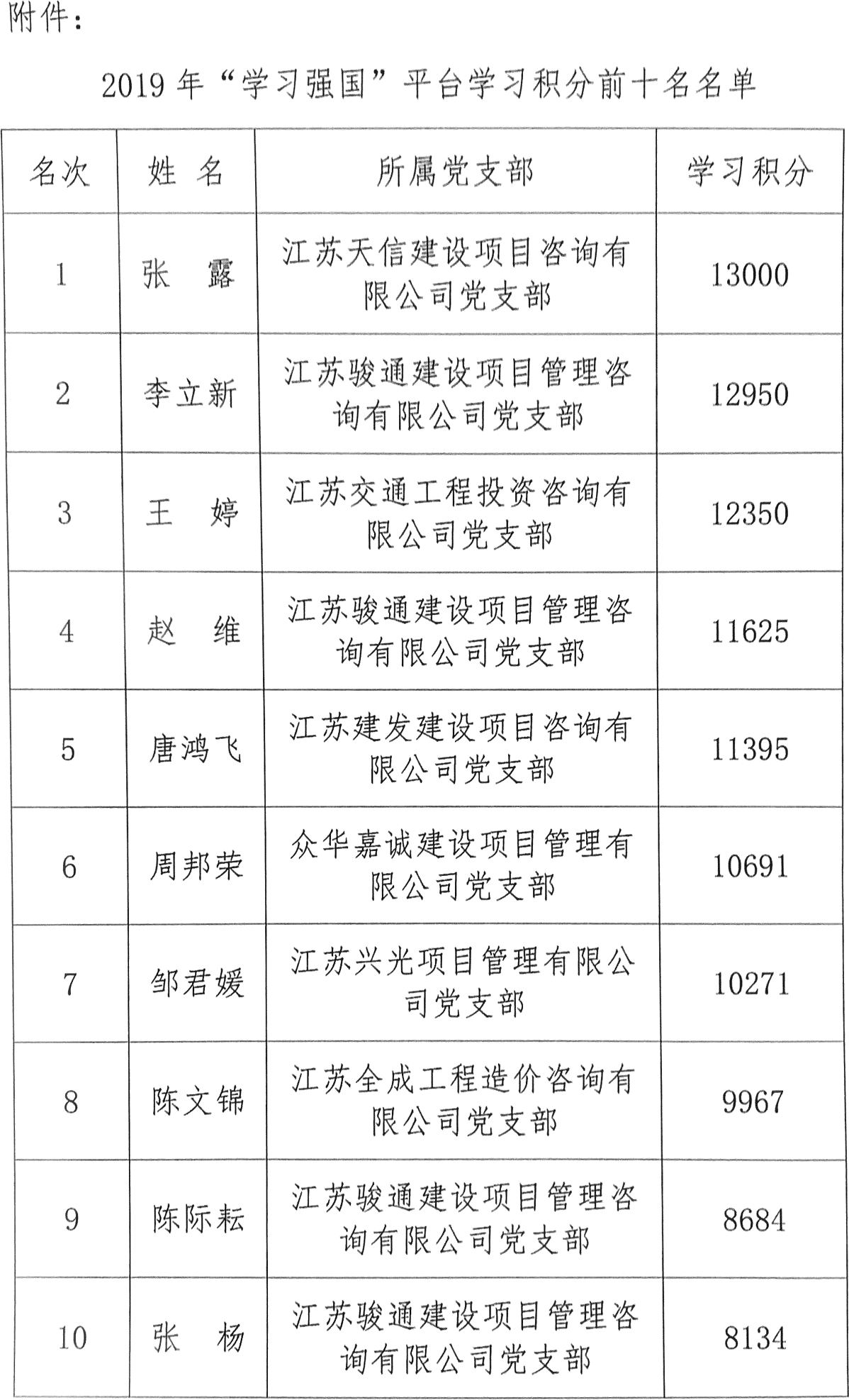 自我公司在党员中推广使用“学习强国”应用程式开始,全体党员积极响应,主动参加,学习热情高涨,学习氛围浓厚。 其中,邹君媛同志表现最为突出,截止2019年12月31日学习积分达到了10271分,并在江苏省建设中介服务行业协会党委组织的“学习强国”活动中取得了个人积分第七名的优异成绩。