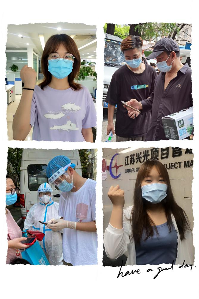 袁家钰、邱光明、蔡梦桐、周盛荣几位新入职员工,面对突如其来的疫情,他们也毫不畏惧,主动报名志愿服务,在疫情中尽显兴光员工风采。除了参加志愿者服务,袁家钰关心所有与疫情有关的事情,7月29日,她无意中看到南京血库告急的消息,想着自己也可以尽一份绵薄之力,她立刻在江苏省血液中心微信公众号上预约。在等待预约时间期间,她又仔细研究了全市所有献血点位、抽检了血样,8月14日一早就去江苏省血液中心献了400ml全血。年轻员工是公司新鲜血液,展现了新一代兴光人的蓬勃朝气。