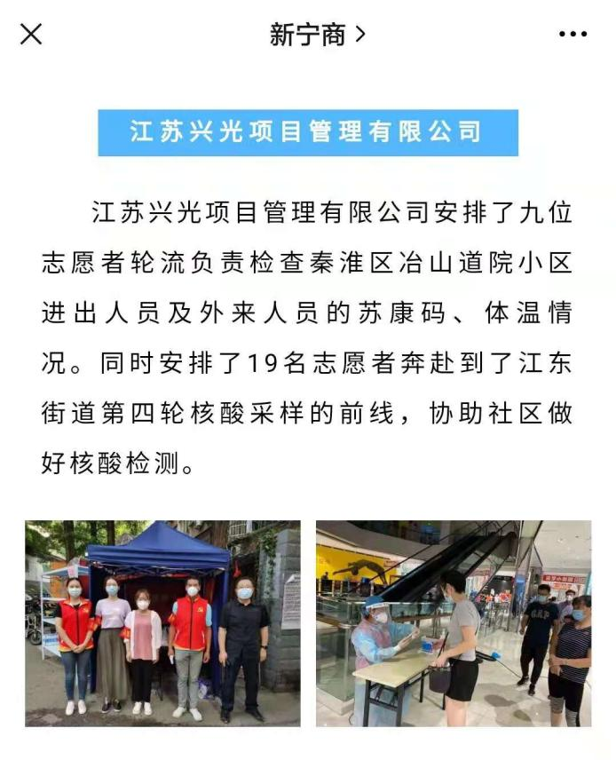 面对这突如其来的疫情,江苏兴光项目管理有限公司全体人员无惧无畏,众志成城,团结一心坚守在抗疫第一线,谱写了一曲“兴中有光,护宁有我”的壮丽凯歌。