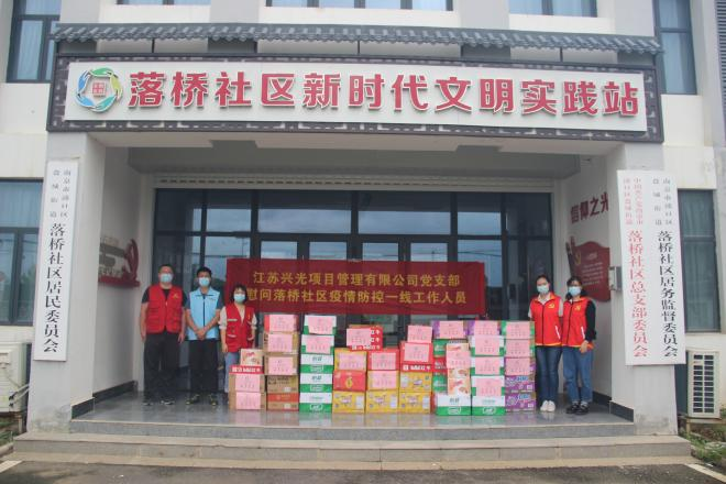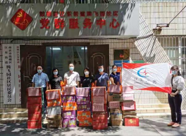 7月29日、30日,江苏兴光分别向盘城街道落桥社区和江东街道腾飞园社区捐献口罩、矿泉水、泡面、饼干等物资。