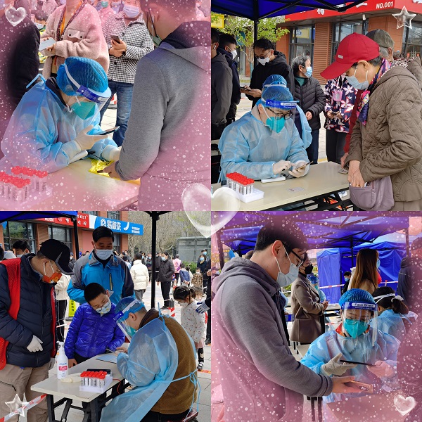 下午,志愿者们按照就近原则承包了公司楼下“龙江里站点”的核酸采集服务工作。志愿者邱光明、潘胜杰、杨娟、杨瑶陆续被安排在一线信息录入的岗位上,他们顶着凛冽的倒春寒风,在阴雨天中坚持配合医护人员完成信息录入工作,一坐就是近5个小时。在大家的相互配合下,龙江里站点的核酸采集工作井然有序地开展着。
