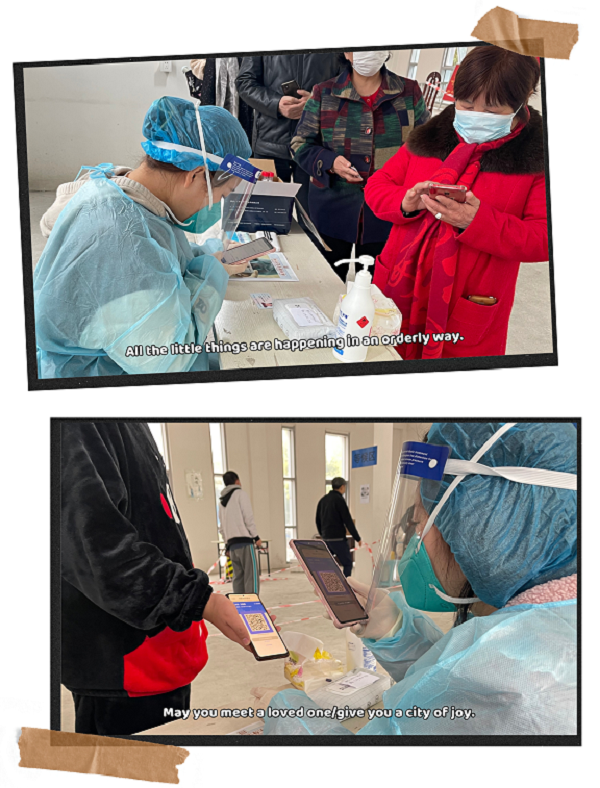 由于我们志愿者出色的表现,受到了社区站点人员的肯定,并要求晚上增派人手。得知消息,李星惠和戴晓晓果断报名。两位女生从白天坚持到夜晚,晚间气温下降,她们仅靠着外面的防护服御风保暖,直到录入完最后一位前来做核酸的居民身份信息已经9点多了。