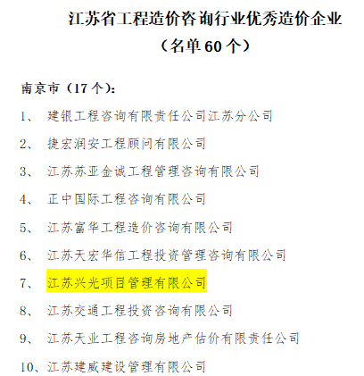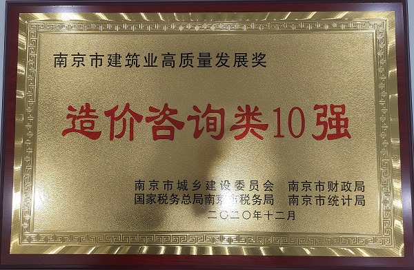 继公司2021年获得南京市建设领域造价咨询十强企业后,近日,公司又荣获“江苏省工程造价咨询行业优秀造价企业”称号。
