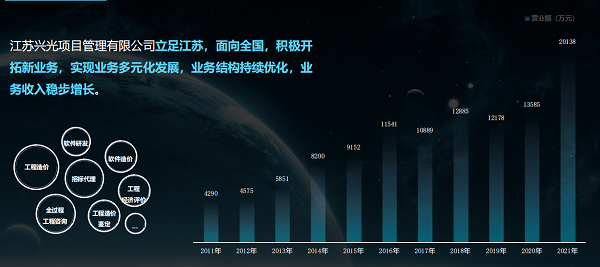 近几年,公司积极开拓业务范围,努力树立企业形象,打造企业品牌,提升咨询业务水平;近3年公司业务收入、人均产值均稳步增长,人员结构得到进一步优化,具有一级造价师及其他注册资格人员占比达到60%;公司信息化建设走在行业的前列,自主开发的建设项目全过程管理系统使公司的信息化管理水平更进一步;公司党建团建工作开展得有声有色,勇于承担社会责任,特别是在新冠肺炎期间,积极参与社会各项公益活动,尽一个优秀企业应尽的责任。