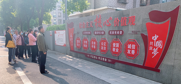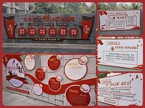 大楼正门设置了主题为“党的百年历程”的宣传板,分别列举了20件从1921年至2021年期间党内重要会议,带领我们重温中国共产党一路走来的筚路蓝缕与光辉历程。在侧门部分用较大篇幅展现了“社会主义核心价值观”,24字铿锵有力,紧密团结,时刻提醒党员不忘初心,牢记使命。另外,宣传栏还分16个专题回答了五个“必由之路”是什么、什么是中国式现代化、中国式现代化的本质要求和特点是什么、如何推进美丽中国建设、如何继续推进实践基础上的理论创新等问题。