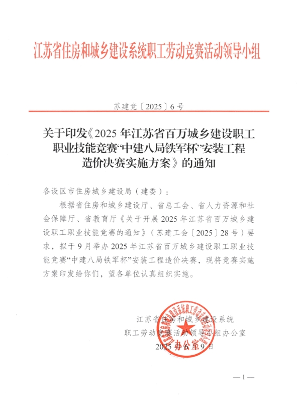 关于印发《2025年江苏省百万城乡建设职工职业技能竞赛“中建八局铁军杯”安装工程 造价决赛实施方案》的通知
